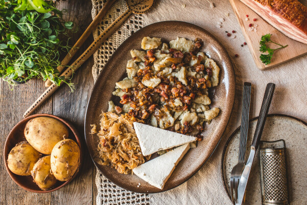 • "Hooves" with lard and traditional potato noodles (with cottage cheese or sauerkraut)
