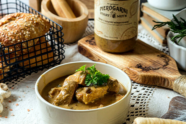 Genuine Polish bigos with wine, pork, bacon and sausage, stewed with aromatic dried plums and forest mushrooms