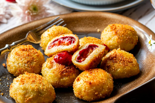 Round and puffy "Knedle" filled with plums and chocolate. Served covered on crispy and golden Panko