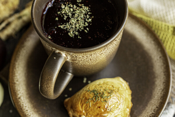 Polish red sourdough borsch with traditional 'ears' pierogi filled with cabbage and mushrooms