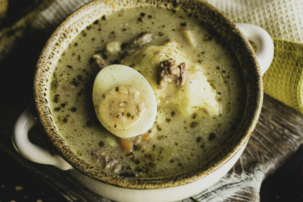 'Kartacze' with homemade white sausage, served on delicate sour rye soup